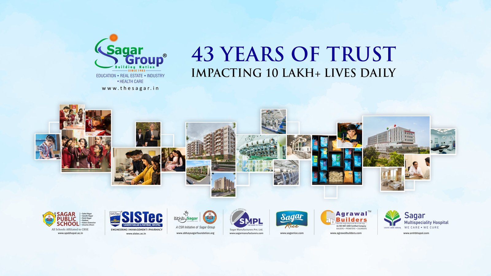 Sagar group believes in its value system and is constantly working towards its mission of ‘building nation.’ it has established itself from one of the largest business conglomerates to a sizable corporate business house in central India. The group caters to the basic needs of individuals and largely impacts communities in healthcare, industry (textile & food processing) education and real estate sectors impacting five lakh lives daily.